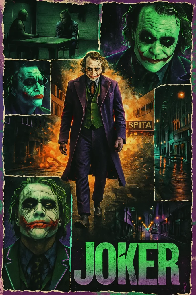 A retro vintage collage design of Heath Ledger as the Joker. The central image shows him walking in his joker outfit with a twisted smile, in front of a hospital exploding. Surrounding this main scene are smaller images in collage style: the Joker sitting in the dark interrogation room with Batman, close-ups of his smeared makeup and chaotic smile, and shots of Gotham City’s gritty streets at night. The atmosphere should be dark and cinematic, with textures like torn paper, halftone dots, and grainy vintage poster effects. Neon accents of purple and green glow throughout the collage, symbolizing chaos and madness. The overall style is nostalgic 80s/90s poster art, bold, layered, and chaotic but balanced, like an underground street collage.