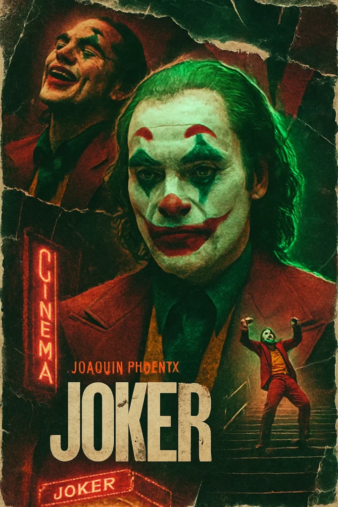 A retro vintage collage design of film Joker (2019). The atmosphere should be dark and cinematic, with textures like torn paper, halftone dots, and grainy vintage poster effects. Neon accents of maroon and green glow throughout the collage, symbolizing chaos and madness. The overall style is nostalgic 80s/90s poster art, bold, layered, and chaotic but balanced, like an underground street collage.