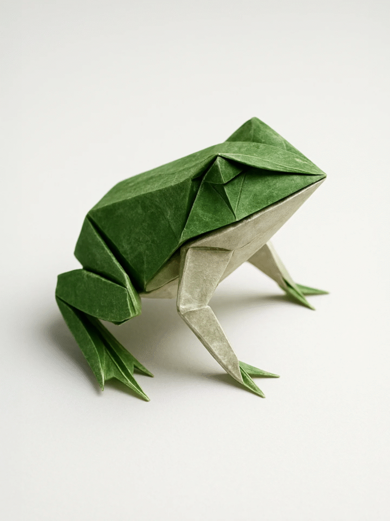 Generate a photorealistic 3D render of a single origami [model] crafted from dual-toned paper, hovering above a pristine white matte surface. Focus on intricate texture details: add subtle paper imperfections like crease wear, gentle crumpling, micro-scratches, and faint fingerprints to enhance realism. Capture the subject from a medium-low angle, illuminated by soft, diffused studio lighting that creates gentle gradients and highlights the paper’s texture. Maintain a minimalist, pure white matte background. Use a color palette dominated by the two distinct tones of the origami paper [color_1] and [color_2] against the white, with hyperrealistic rendering style emphasizing material accuracy and lifelike details.