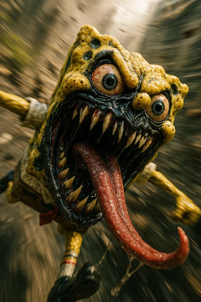 Venom mixed with SpongeBob! Style is high-detail photograph, hyper-realistic, cinematic. It CANNOT be an illustration, anime, or painting. It can’t have bokeh. Make it a 4-dimensional-port-wimmelbilder of a monumental moment with dynamic warped perspective. Fish-eye lens without vignette. Extreme-45°-angle-dutch-tilt. Extreme-close-up. High speed action. Motion blur. Not a painting!